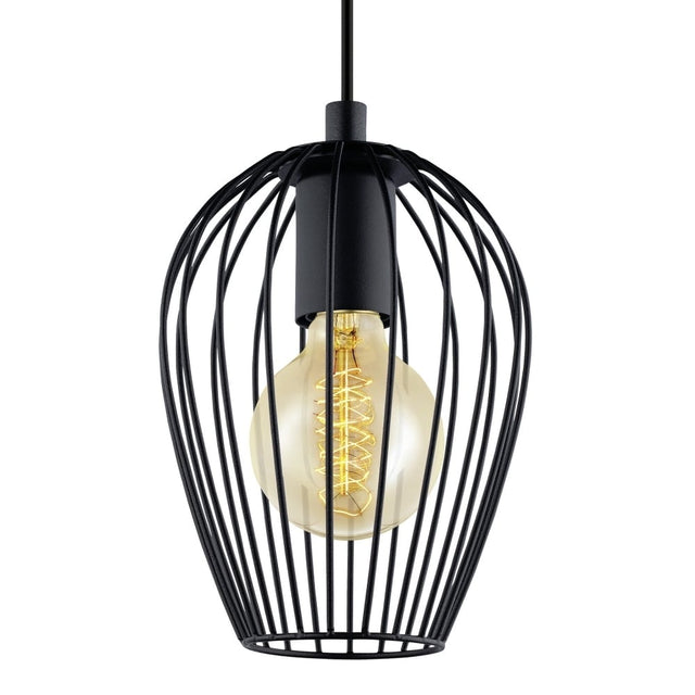 The stylish Cage dome light shade hanging from a black flex cable with a steel and black fitting attached to the ceiling. The Newtown range from elgo is edgy lighting with a style of art.
