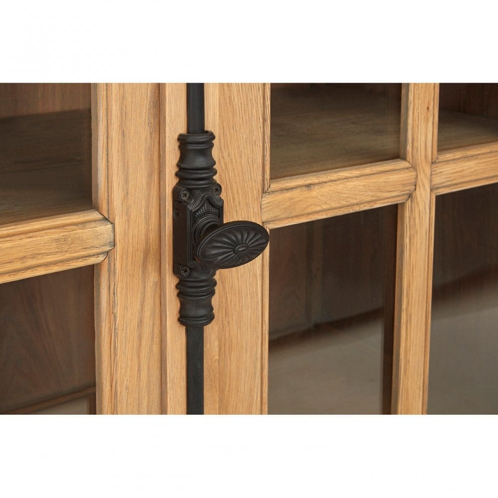 • Features: Natural oak wood, Four glass panelled doors, Carved metal handles, Rustic statement piece, Statement piece.