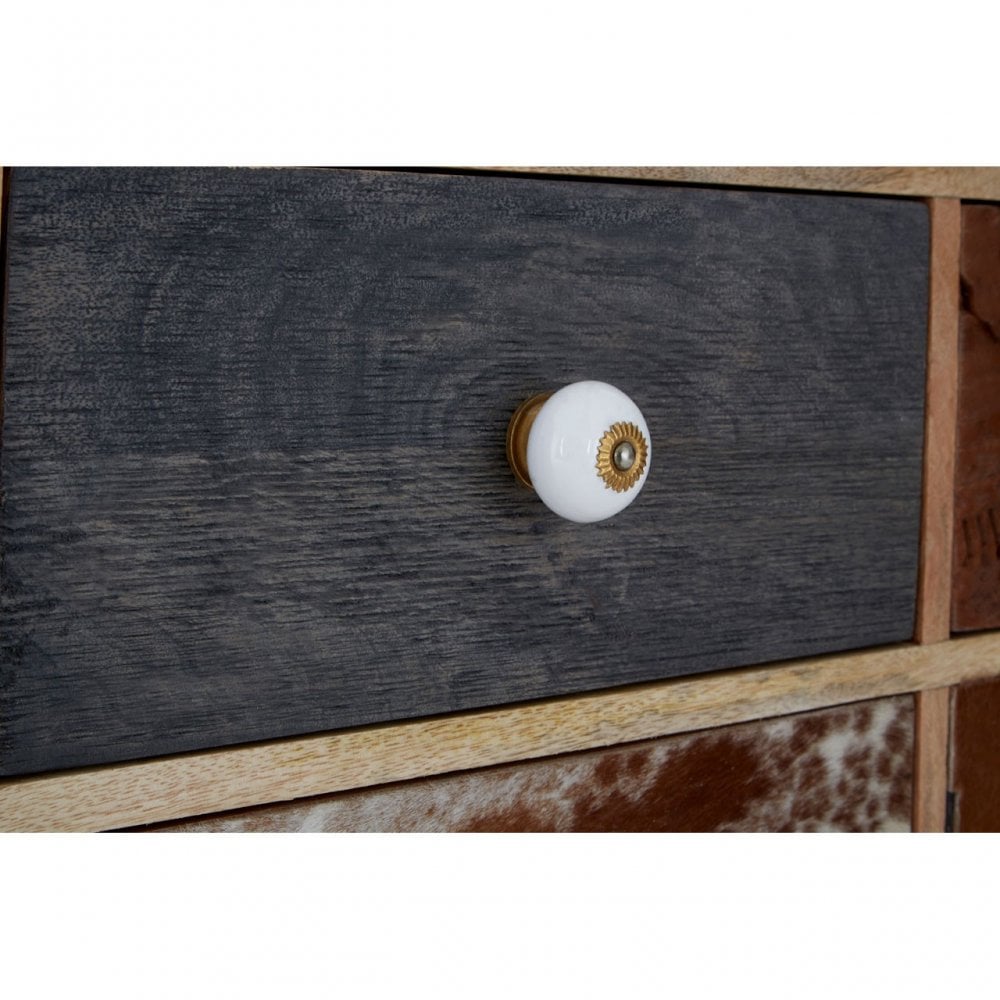 Each of the sideboard's five drawers and two cupboards boasts a different finish, from genuine brown and white cowhide to intricately carved patterns finished in a range of natural tones. A variety of different handles and knobs enhance the sideboard's eclectic aesthetic and lend metallic counterpoints to the natural wood.