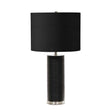 Black resin table lamp with Brushed Nickel accents. Includes a Black faux linen hard-backed shade. LS3018