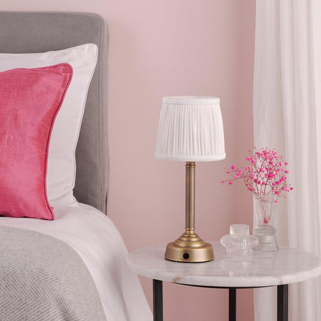 £8100 GBPUnit price /UnavailableIn stock (100 units)Virgil Rechargeable Table Lamp Matt Antique Brass With Shade LED