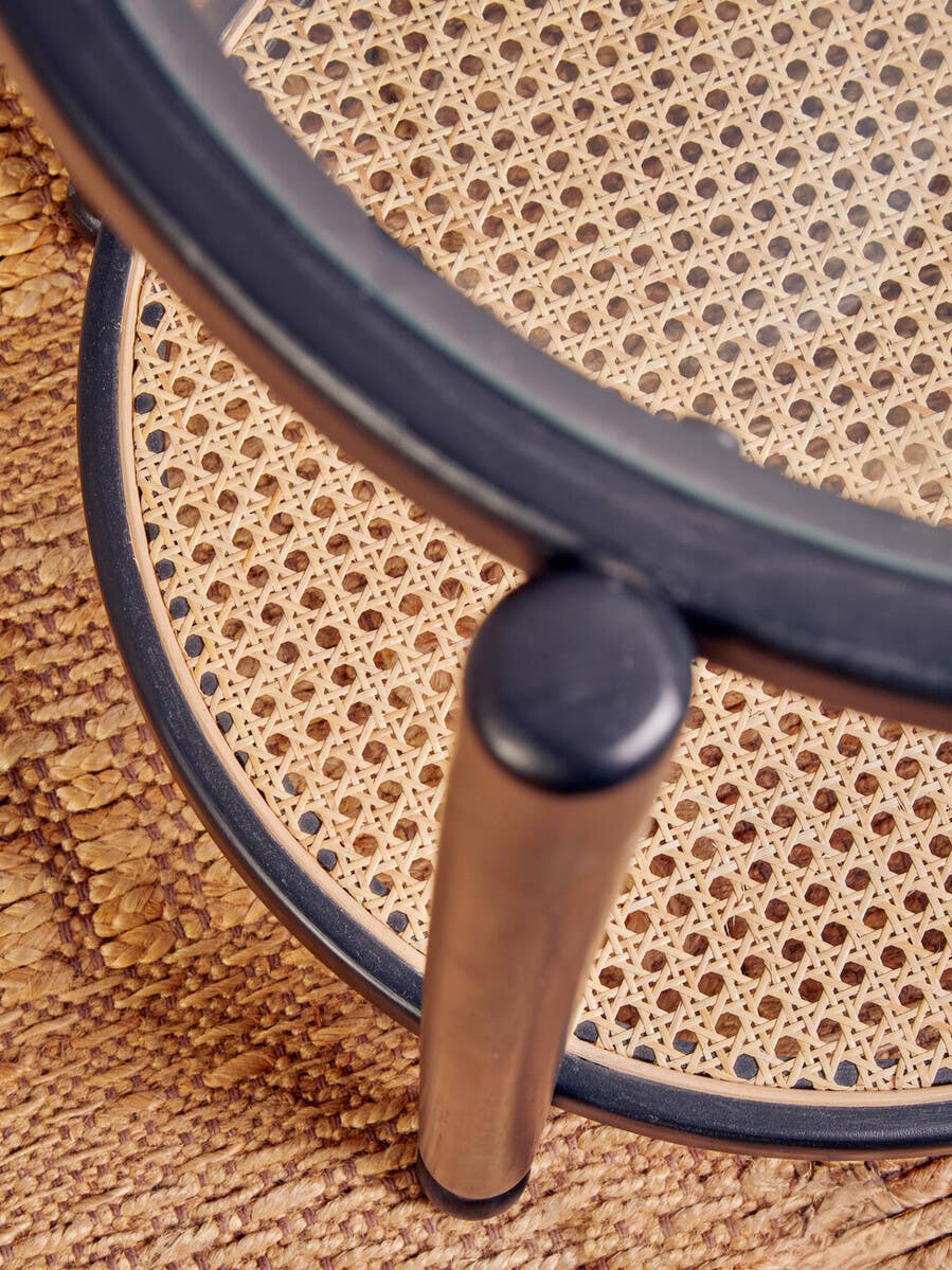 Made from elm wood, this console table introduces modern minimalism with a black finish frame featuring clean lines and rounded corners. A clear glass top rests on the frame complete with a lower shelf, formed by the natural cane in an open weave.