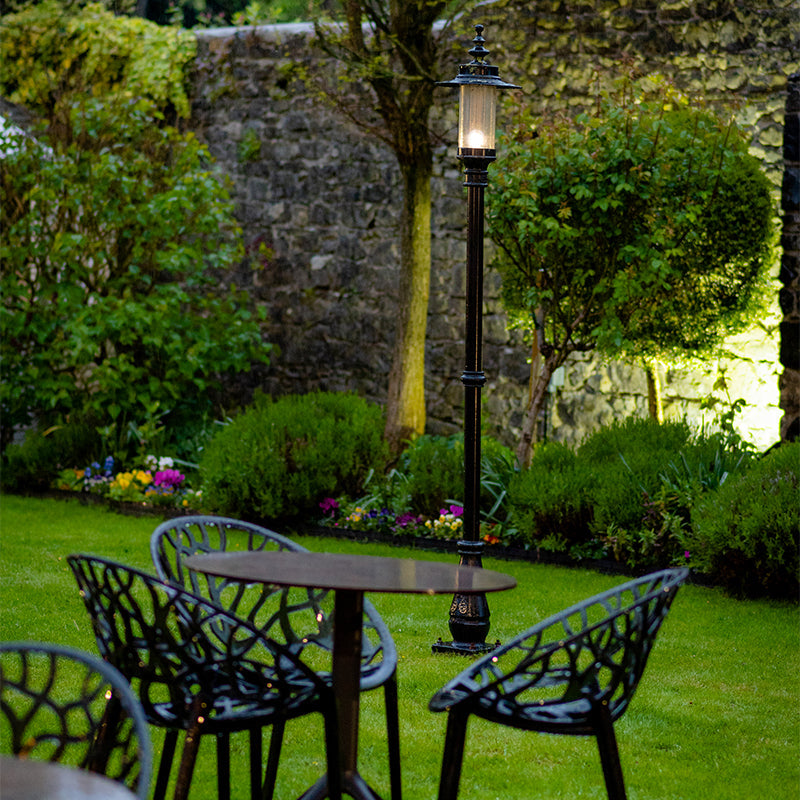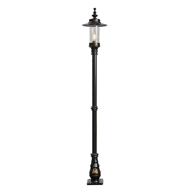 Georgian style lamp post in cast iron and steel 2.21m in height Inspired by the classical and functional features originating from the Georgian era, the cylindrical design from the Courtyard range allows for maximum lighting spread through the polycarbonate glazing while the ornate capping encloses the light source, reduces light pollution and reflects the light spread downwards.