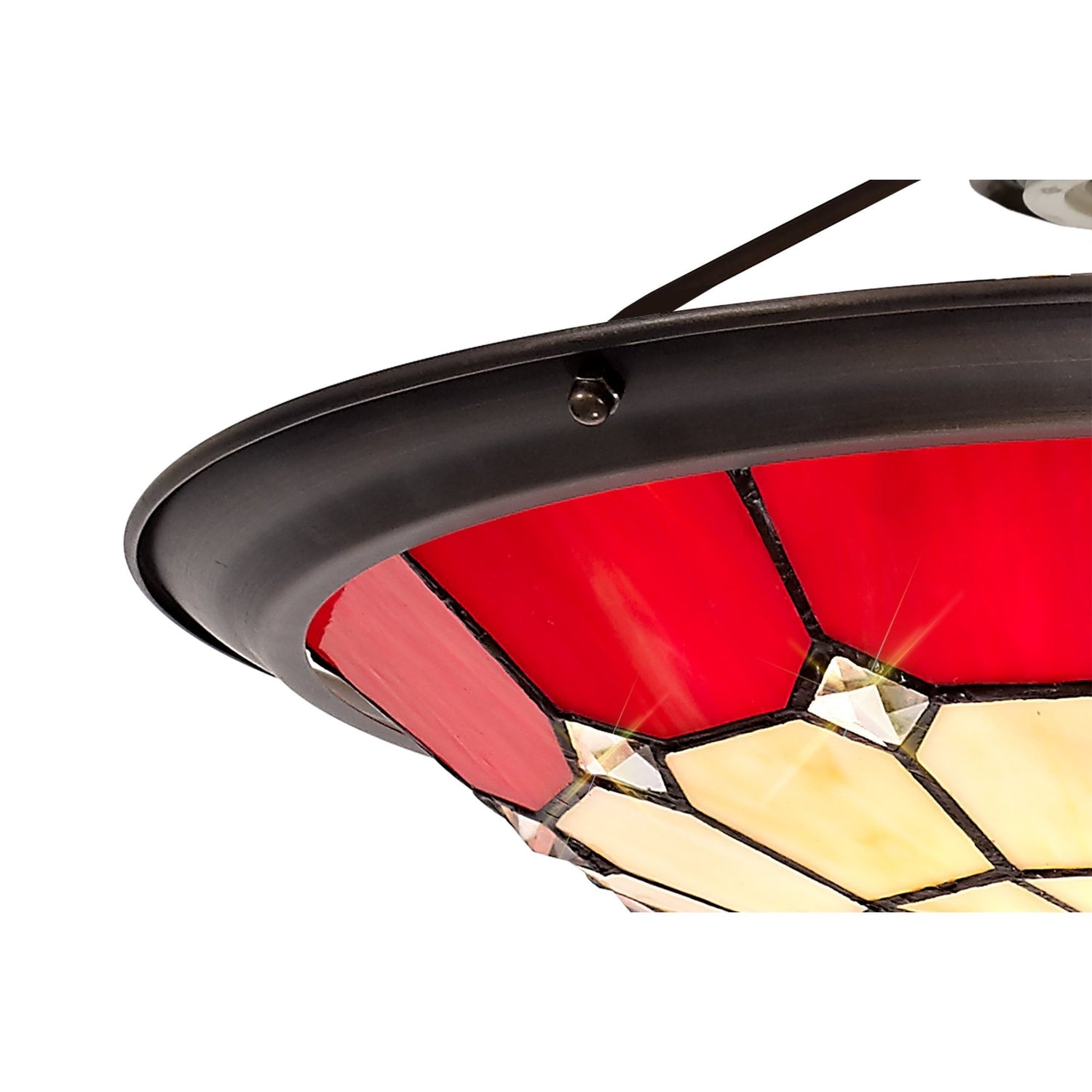Elegant Red and Cream Tiffany Pendant Light with Antique Brass Accents and Crystal Detail is backordered and will ship as soon as it is back in stock.