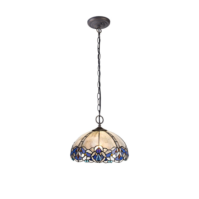 Elegant Dual Light Pendant with Tiffany Shade in Blue Crystal and Antique Brass Finish