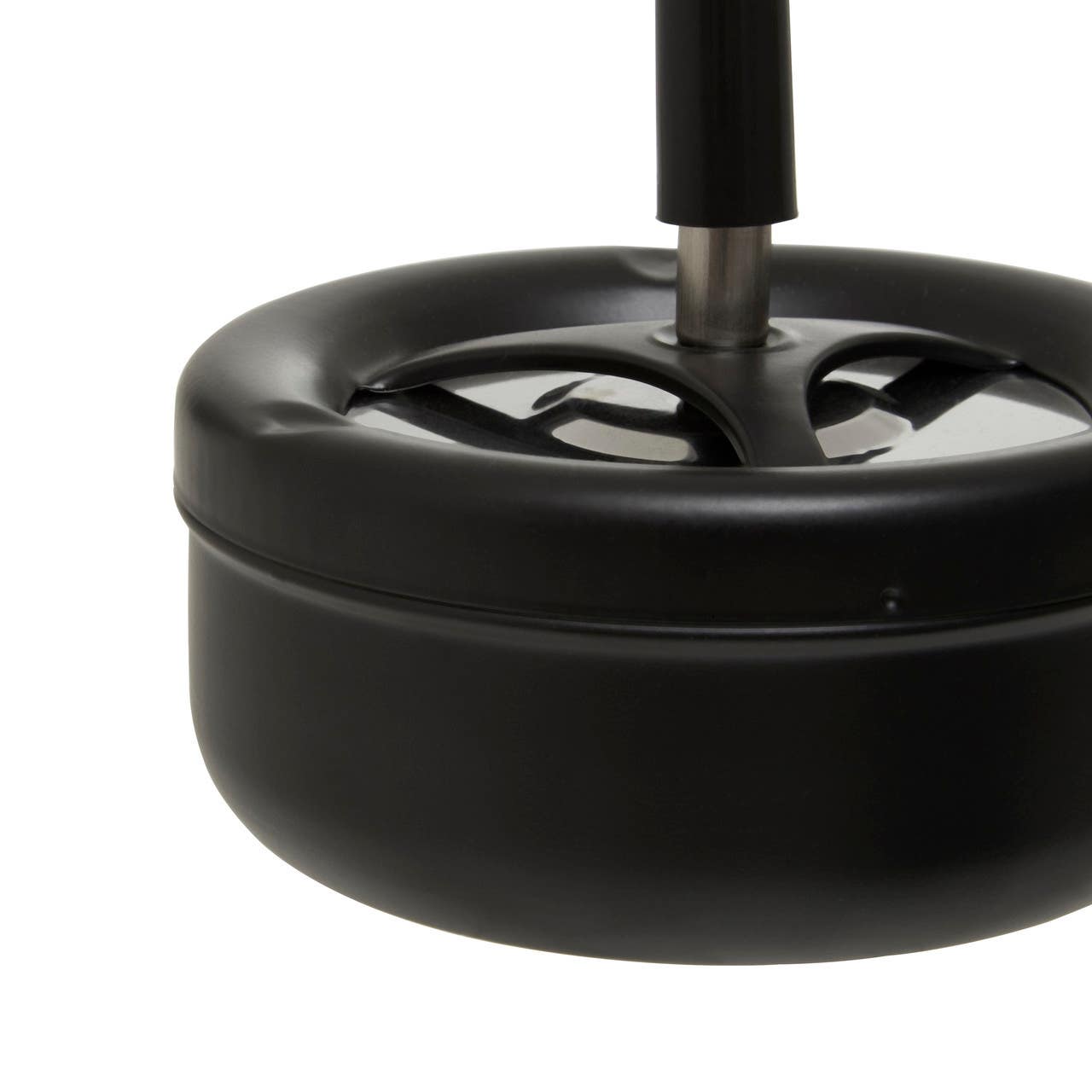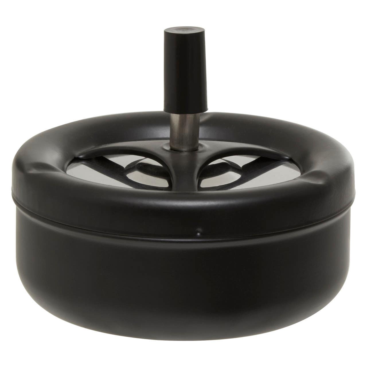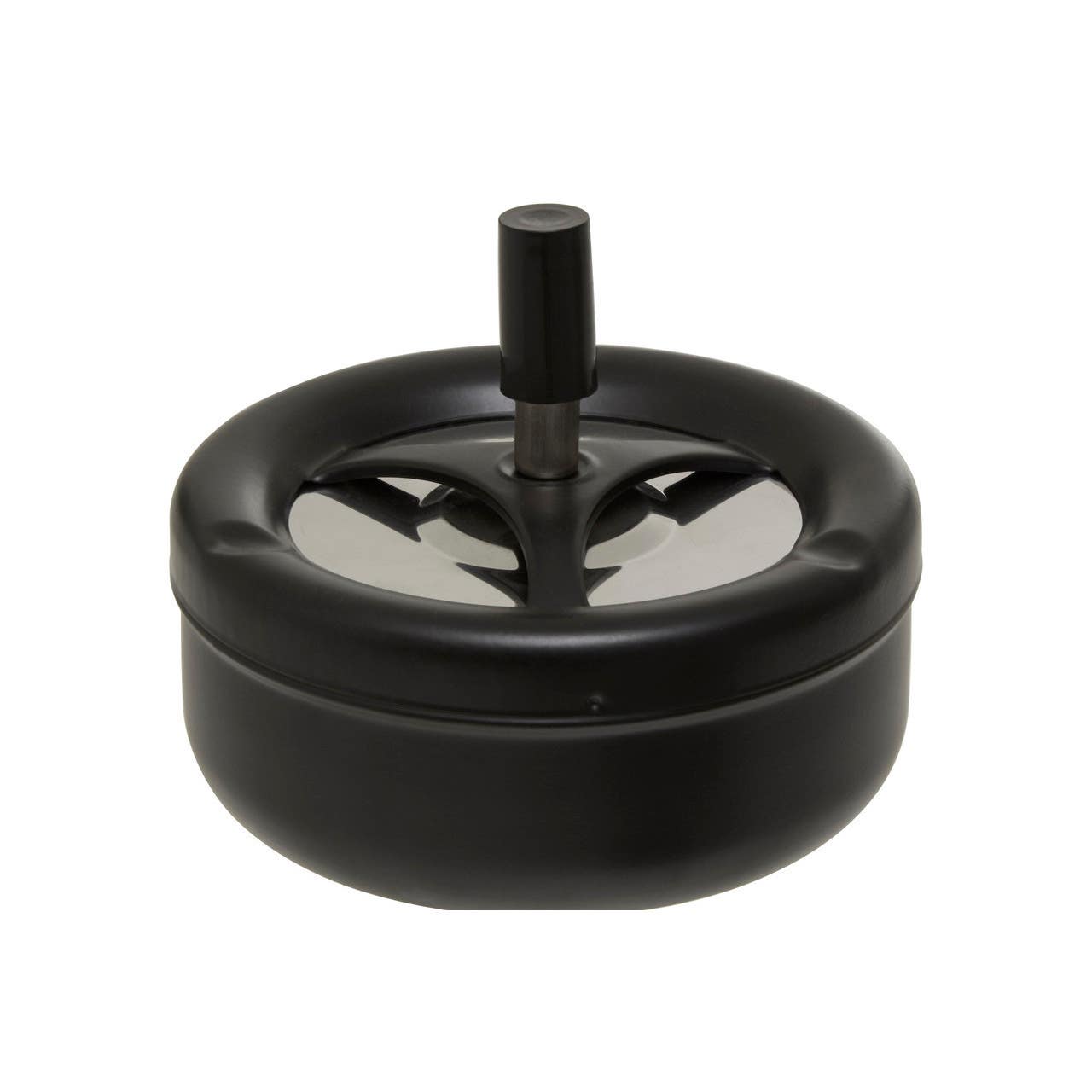 "This black ashtray in matte finish features a removable lid to dispose of ash. Exhibiting a contemporary design, this large-sized spinning ashtray is an ideal smoking accessory for everyday use at home."