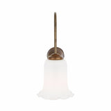 The Arklow wall light is a traditional wall light with a white crimped edge bell glass lamp shade. It has a simple, curved arm attached to a matching wall bracket and gallery.