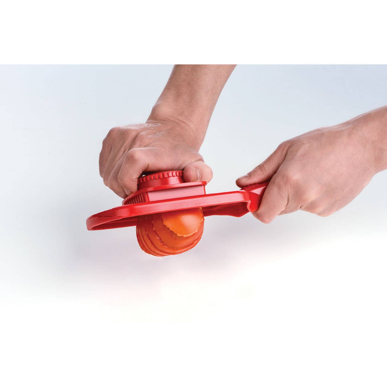 "Making food preparation more efficient, the hand held tomato slicer with press is an easy to use everyday utensil that is designed to make your time in the kitchen quick and convenient. Made using strong yet lightweight red PP plastic with stainless steel."