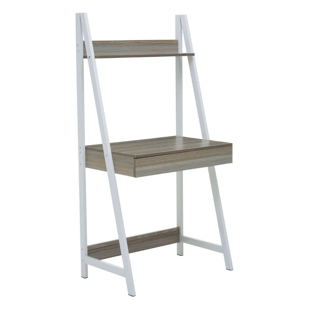 Featuring a pull-out slider with two storage compartments, this desk exhibits an understated design for home office setting. The rectangular top in dark oak veneer effect sits upon an angular metal frame in the white powder coating finish.
