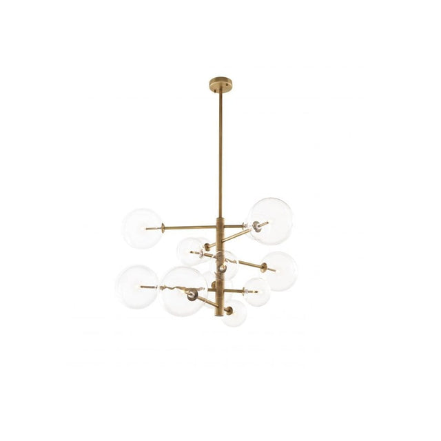 Create a retro-chic focal point in your living space with the Argento S Chandelier. This asymmetrical interpretation of Mid-Century Modern designer lighting instantly elevates your room! It features an antique brass finish and 12 hand blown clear glass globes.