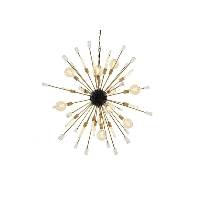 Enjoy the retro charm of the Tivoli L Chandelier, a contemporary interpretation of the classic Sputnik chandelier. Contemporary with a vintage twist, the sunlike armature with black and brass finish features a starburst design of contrasting rods with clear glass embellishments.