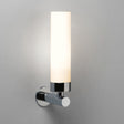 Tube bathroom wall-light. Polished chrome finish, white opal glass diffuser. Uses a 40w (max) E14 lamp (excl). IP44 rated, suitable for bathroom zones 2 and 3. Class II, double-insulated.
