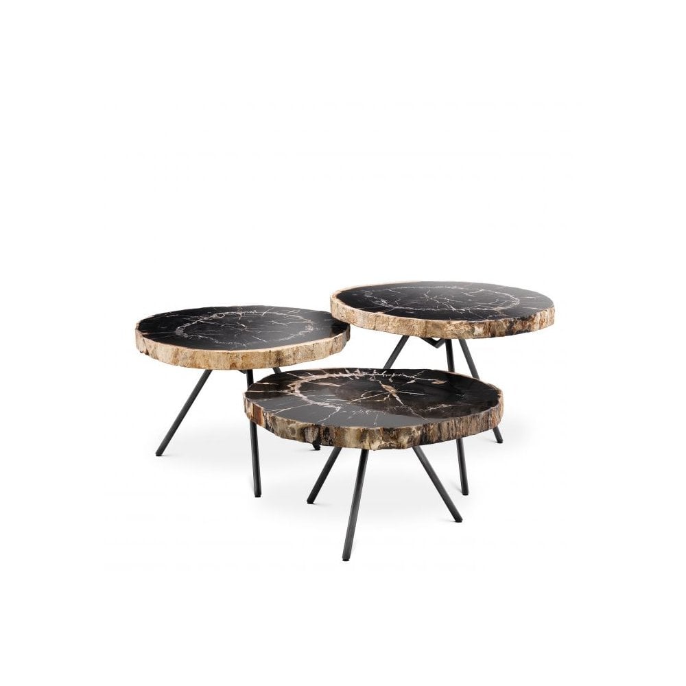De Soto Trio Coffee Tables: Dark Petrified Wood with Black Bronze-Legged Elegance