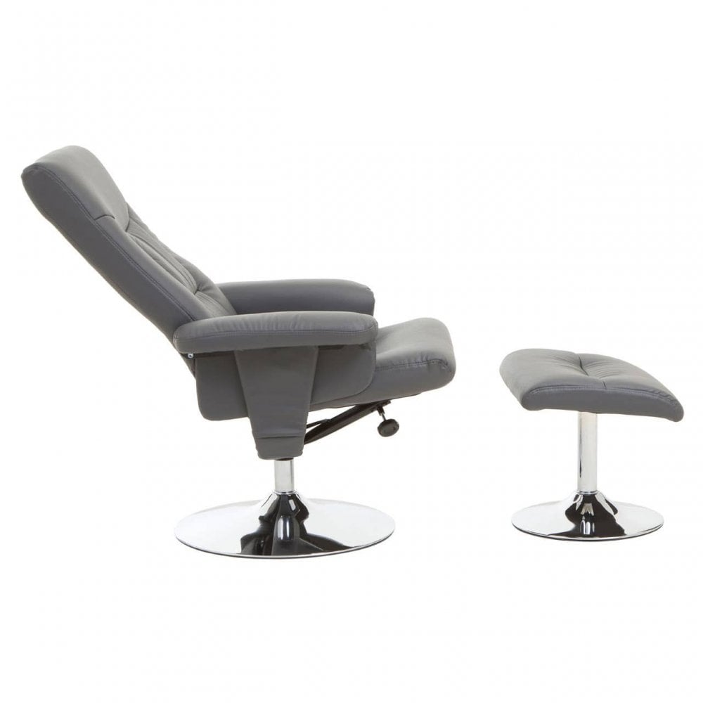 - Upholstered in grey PU leather, the Denton recliner chair is complemented with a matching footstool to provide optimum comfort. Supported by a chrome finish pedestal base, this chair has a 360-degree swivel which brings functionality and maximum comfort.
