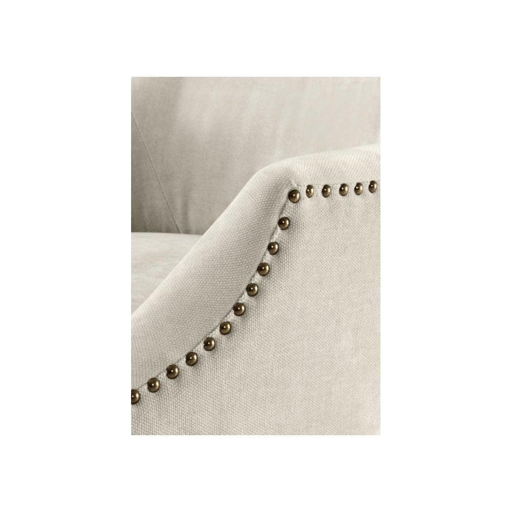 Legacy Dining Chair: Clarck Sand Upholstery with Antique Brass Accents and Black Legs is backordered and will ship as soon as it is back in stock.