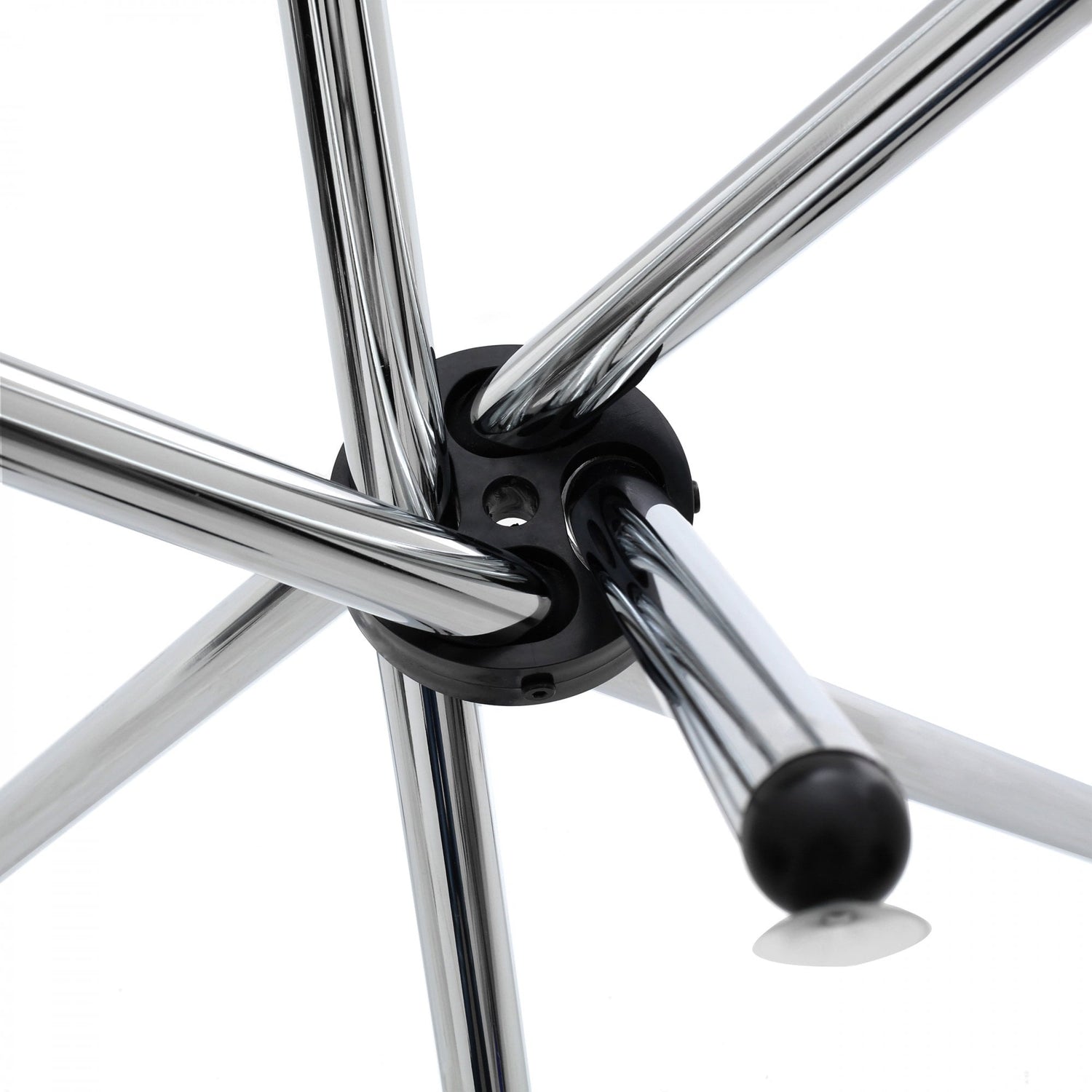 Whether you're having a romantic meal for two or hosting a party, the beautiful glass dining table will provide an excellent piece of furniture to suit your needs. The sleek, clear tempered glass is durable for everyday use. Four stylish chrome legs criss-cross and attach to the table with the use of suction cups. This is where the ingenious design works. If you require extra space or are moving, simply remove the glass table and fold the legs into a single column for compact storage. As practical as it is elegant, the glass dining table will bring a fashionable and unique look to your home.