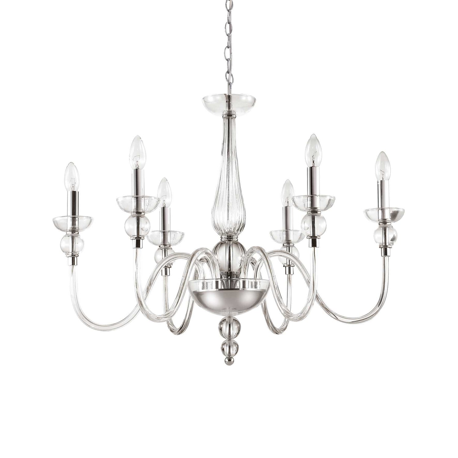 Hand-shaped blown clear or white glass chandelier. Chrome metal frame and details.
