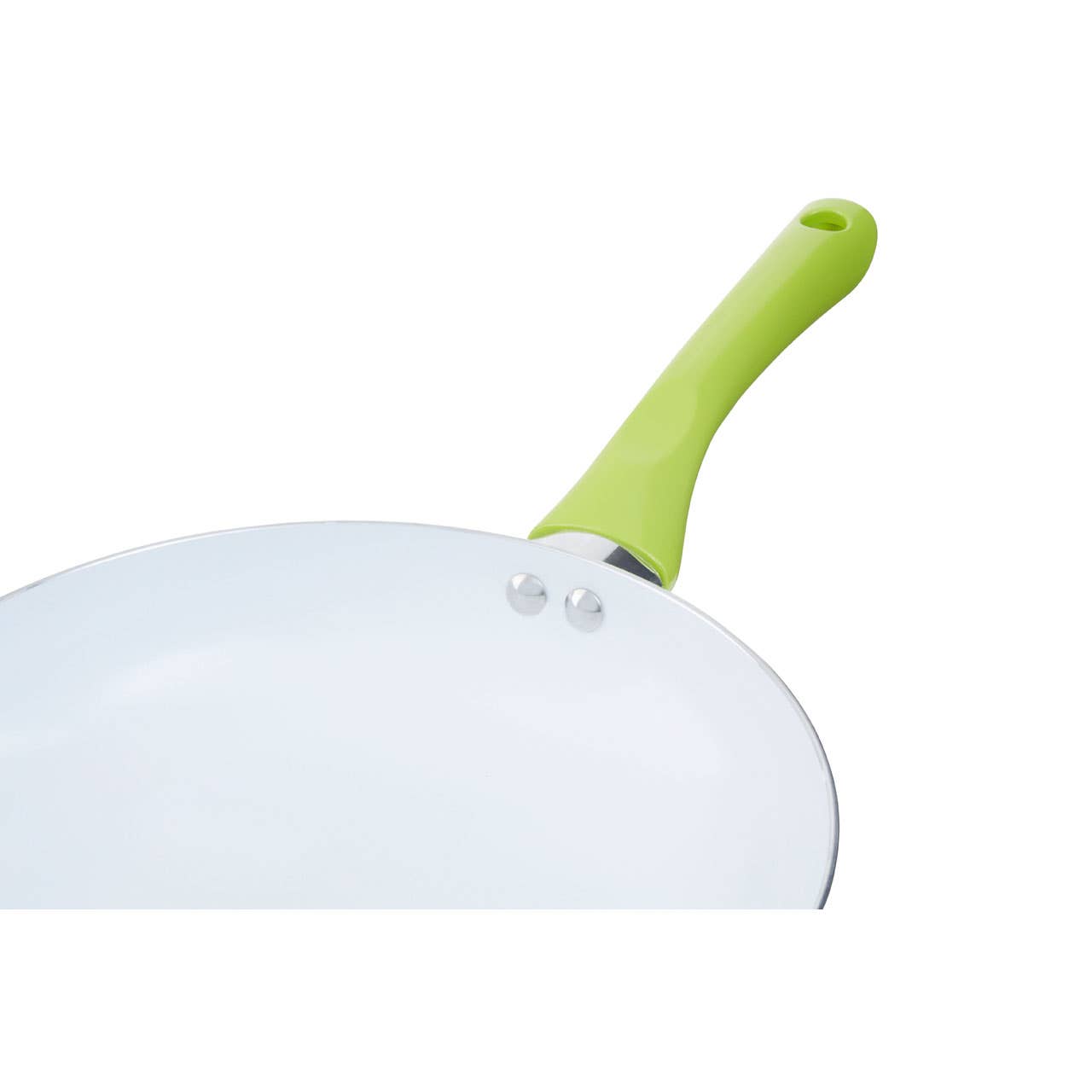 "Avoid having a kitchen nightmare with the Good Housekeeping Institute approved 26cm aluminium Ecocook frypan. Moving away from the traditional non-stick plastic coatings, the Ecocook frypan's non-stick properties are made from minerals with no PTFE or PFOA. This ensures in case of accidental overheating, the coating will not blister and release toxic fumes into your meal or kitchen. Having a ceramic coating, the heat is more readily conducted, therefore less energy is spent heating the frypan. Ceramic non-stick coating also has exceptional hardness, durability and offers health and ecological benefits. The handles are made from Phenolic resin which is excellent in heat resistance. The lime green and white design will bring freshness and a touch of colour to your kitchen. So whether your cooking meats, vegetables or fish, the Ecocook frypan is suitable for all hobs, including induction, making this the perfect tool for all your cooking needs."