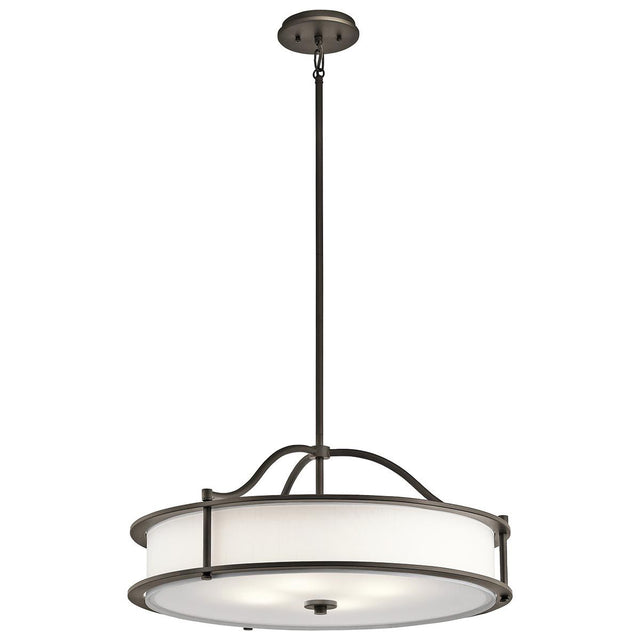 The contemporary Emory collection has a clean, simplistic design in either an Olde Bronze or Classic Pewter finish with an off-white fabric drum shade and glass diffuser.