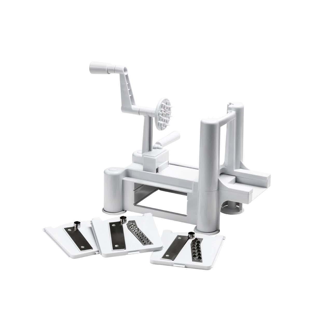 "Make food prep more efficient with the easy to use 3 in 1 spiral slicer and serve up professional looking meals to friends and family in no time. Made from durable, yet lightweight, white ABS, the spiral slicer is a fantastic addition in all kitchens."
