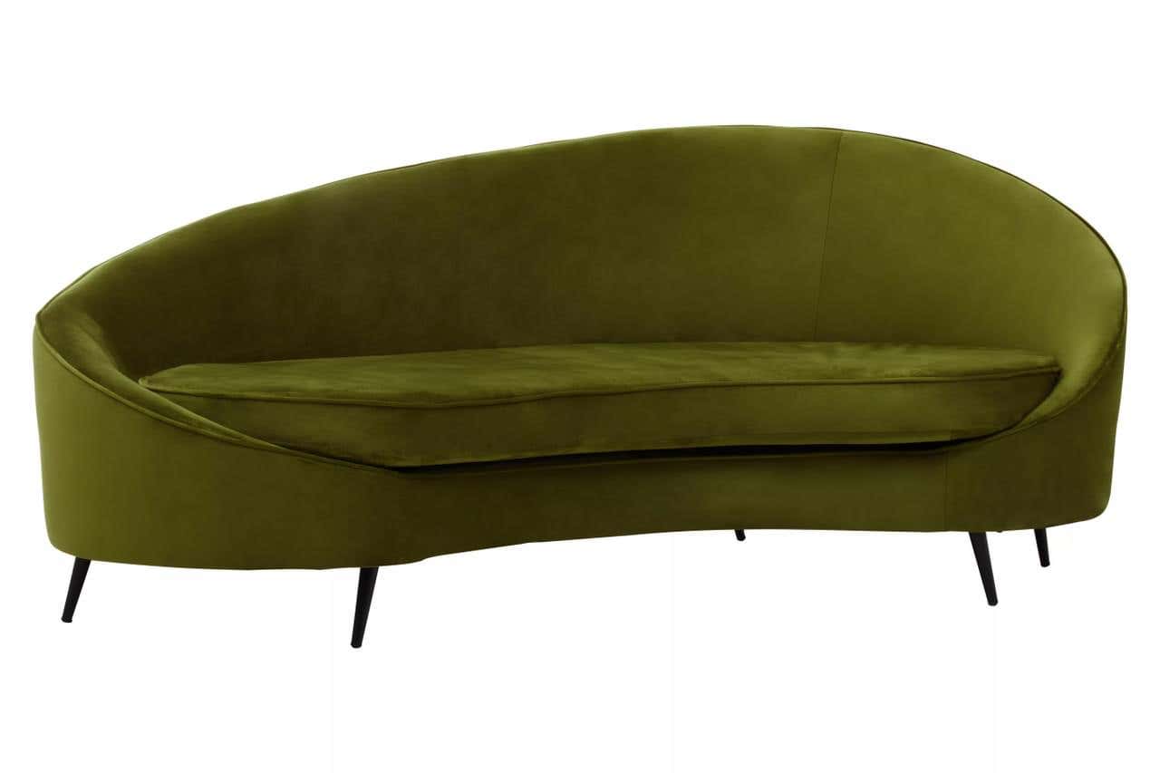 The Hasina three seat sofa boasts a sculptural form with an olive velvet upholstery. The thick foam padding ensures comfortable seating and the matte black metal legs provide firm support whilst enhancing style.