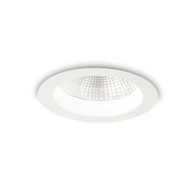 Die-cast aluminum recessed spotlight with round seal. Suitable for the installation on plasterboard ceiling. Matt white finish, COB Chip on Board and SMD technology. Front protection IP44 (after installation of the product).