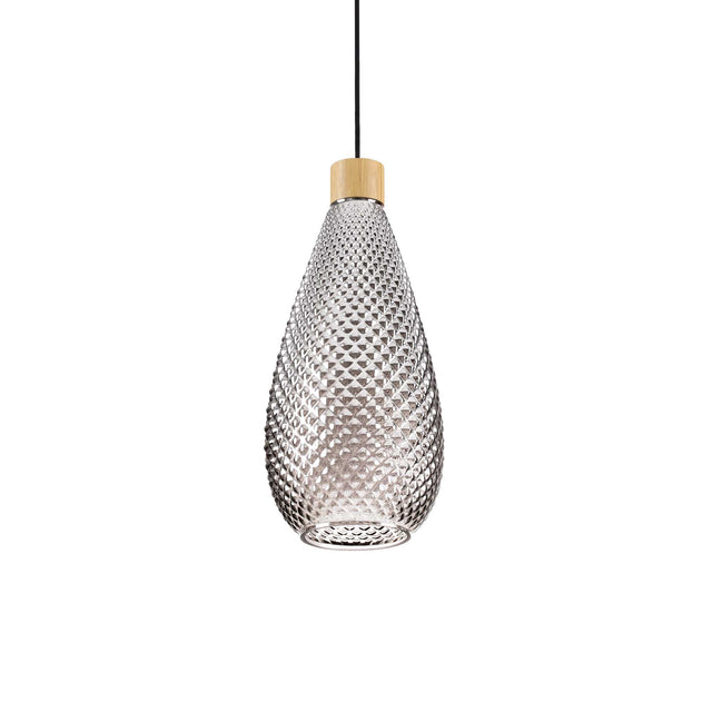 Black powder coated metal ceiling cup. Natural wood frame. Clear blown glass diffuser with motif in relief and smoky finish. Power cable coated with fabric.