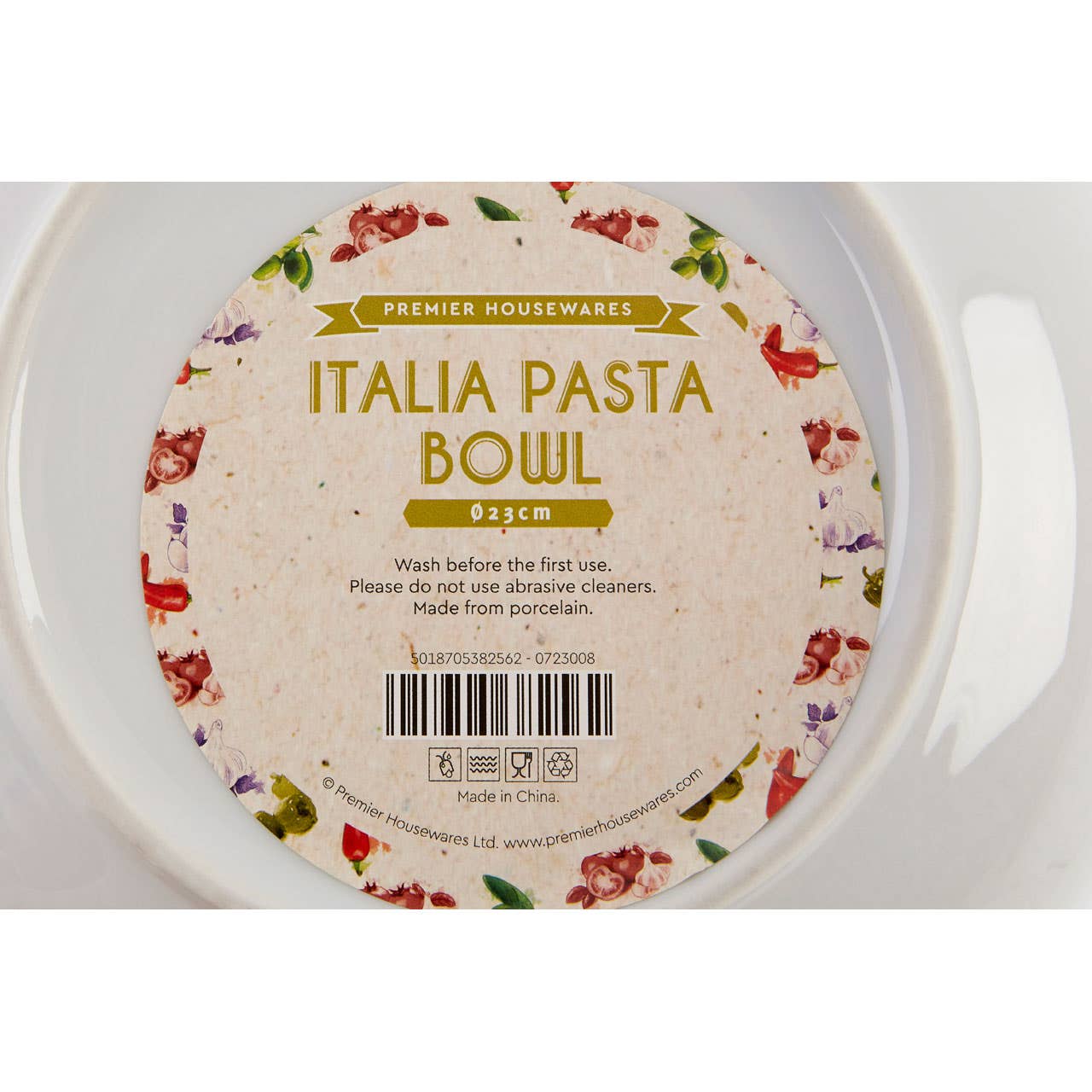 "Its glazed finish gives the bowl a reflective look, while its raised sides make it easy to serve a generous portion of pasta. Its central tomato and garlic design stands out clearly against the white, with grey delizioso lettering beneath that expresses Italian charm. Coordinate it with the Italia antipasti plates."