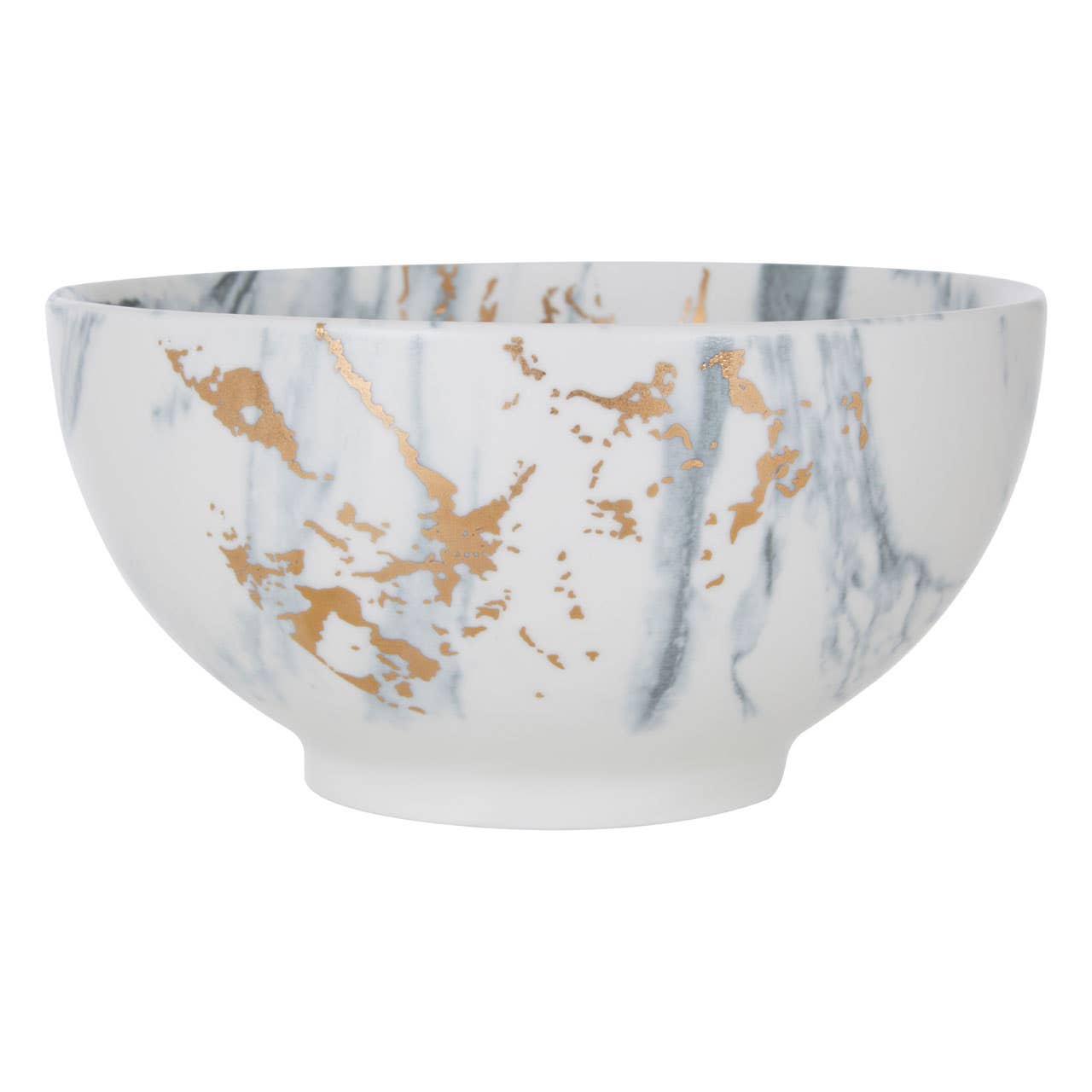 "The Marble Luxe salad bowl has seamlessly curved raised sides integrated to a minimal base creating ample depth for contents. Made from porcelain, its matte finish accentuates prominent marble like veining in muted tones which gives it a distinctive appeal."