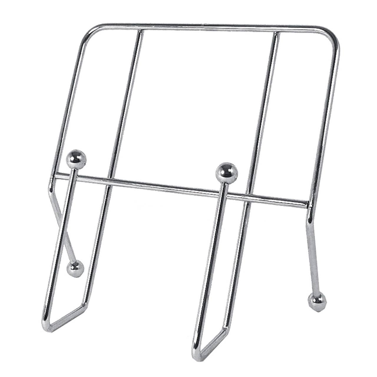 "Open your cook book at the right page for the recipe you want, and place it in the stand. The front arms will hold your book open at the right page at an angle that makes it easy to read. Keeping your book away from the kitchen surface means it is less likely to get splashed or stained. The stand can hold a book up to 6cm thick, and since its made from chromed metal, it's very easy to keep clean."