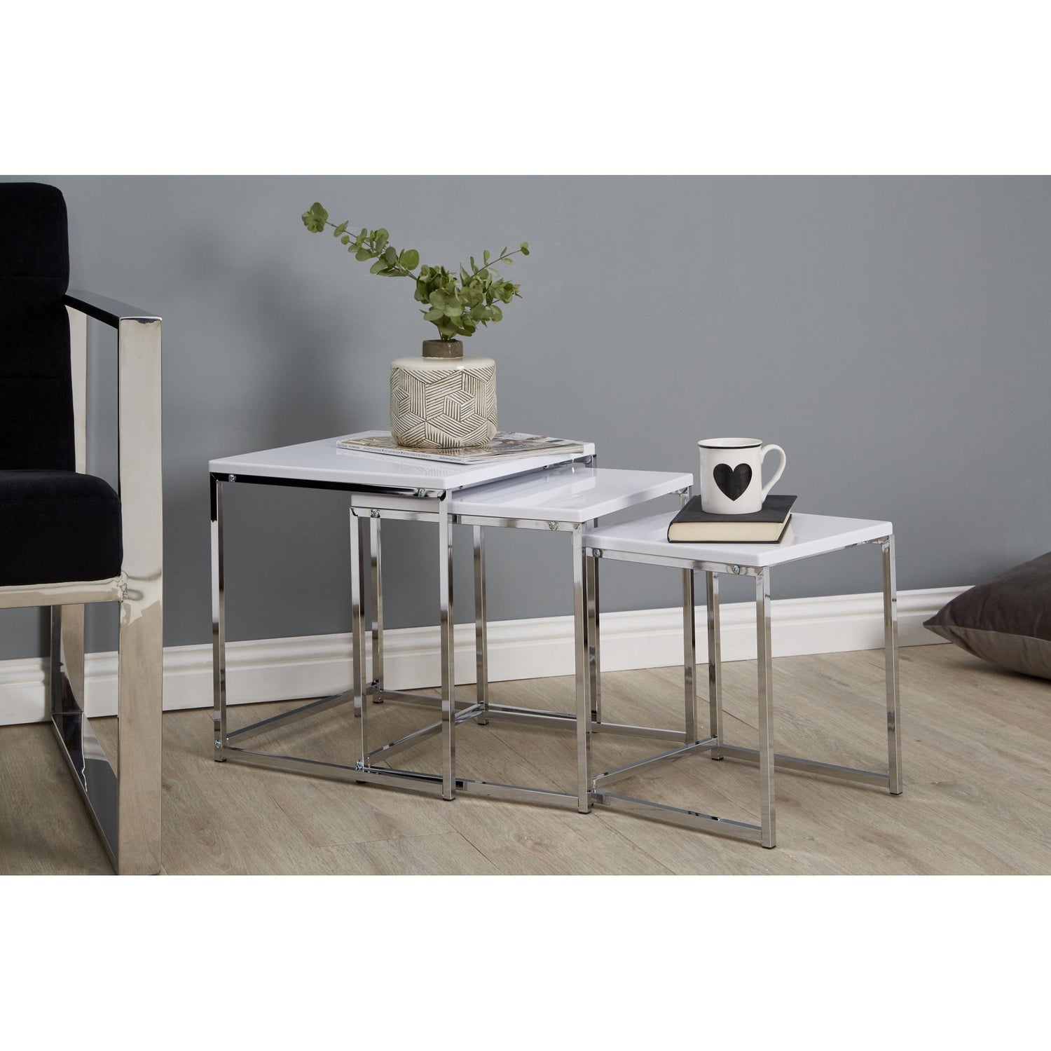 Elegant and modern, the nest of three tables bring a contemporary and sophisticated look to your living area. Invite friends and family round to your home for a get together and be the perfect host by having plenty of table surfaces on which to serve snacks and drinks. The white high gloss surface and chrome finish frame is perfect to lighten up your home. The tables stack neatly for compact storage, allowing you to bring out one, two or all three whenever you need them. Sturdy and practical for everyday use, the nest of tables are an ideal addition to your home.