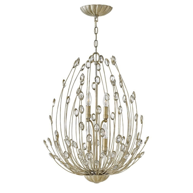 Tulah’s multifaceted asymmetrical design is hand crafted with artisan details. Its beauty unfolds in layers, revealing delicately scalloped canopies, a lustrous Silver Leaf finish, and dazzling faceted clear crystal embellishments adding the perfect amount of sparkle.