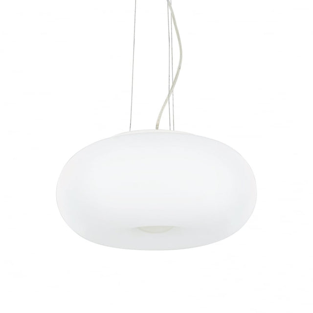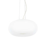 Metal frame coated with matt white enamel. Blown acid-etched white glass diffuser. Suspension models provided with steel cables adjustable in length with automatic blocking mechanisms.