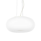 Metal frame coated with matt white enamel. Blown acid-etched white glass diffuser. Suspension models provided with steel cables adjustable in length with automatic blocking mechanisms.