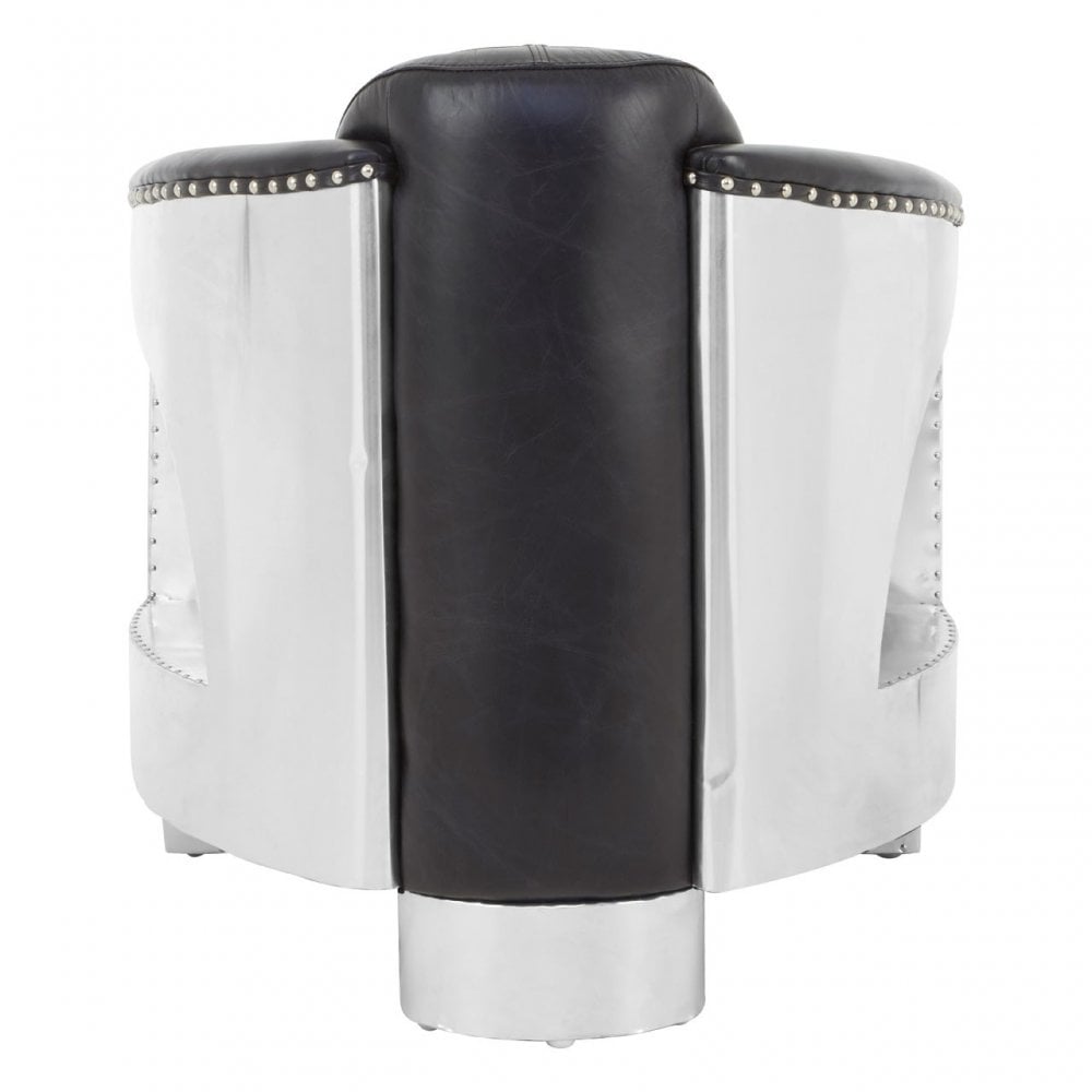 This chair has rivets with silver stud detail, further enhanced by aluminium wrapping on the back and sides. The industrial look is accentuated by the genuine black leather seat and backrest with channel stitch detailing which offers a textured contrast to metallic studs. Gently curved arms coordinate with the rounded profile of the chair.