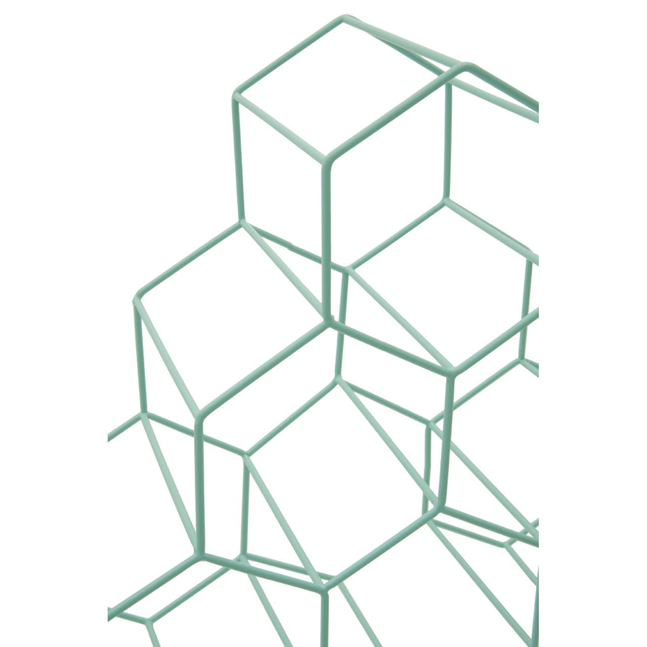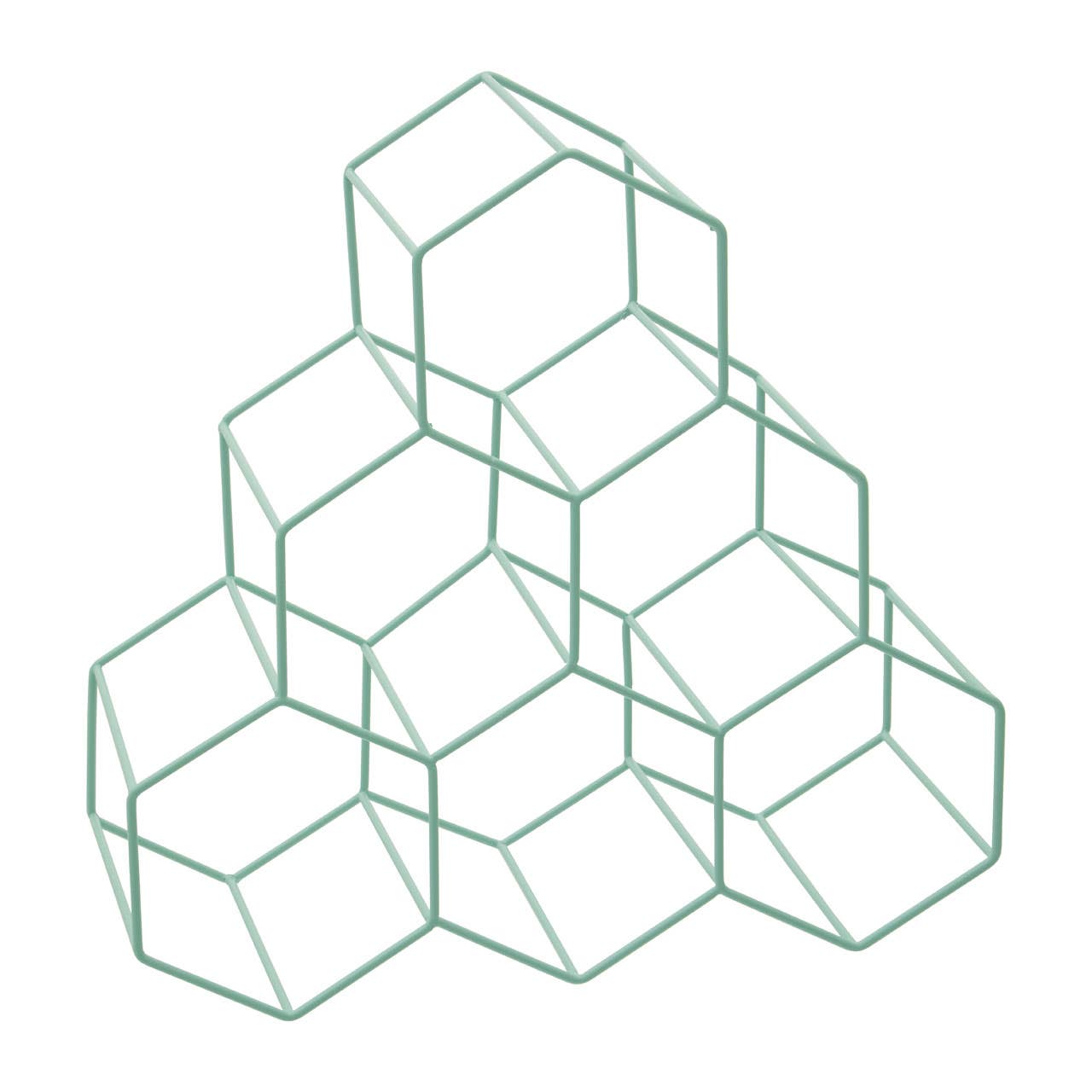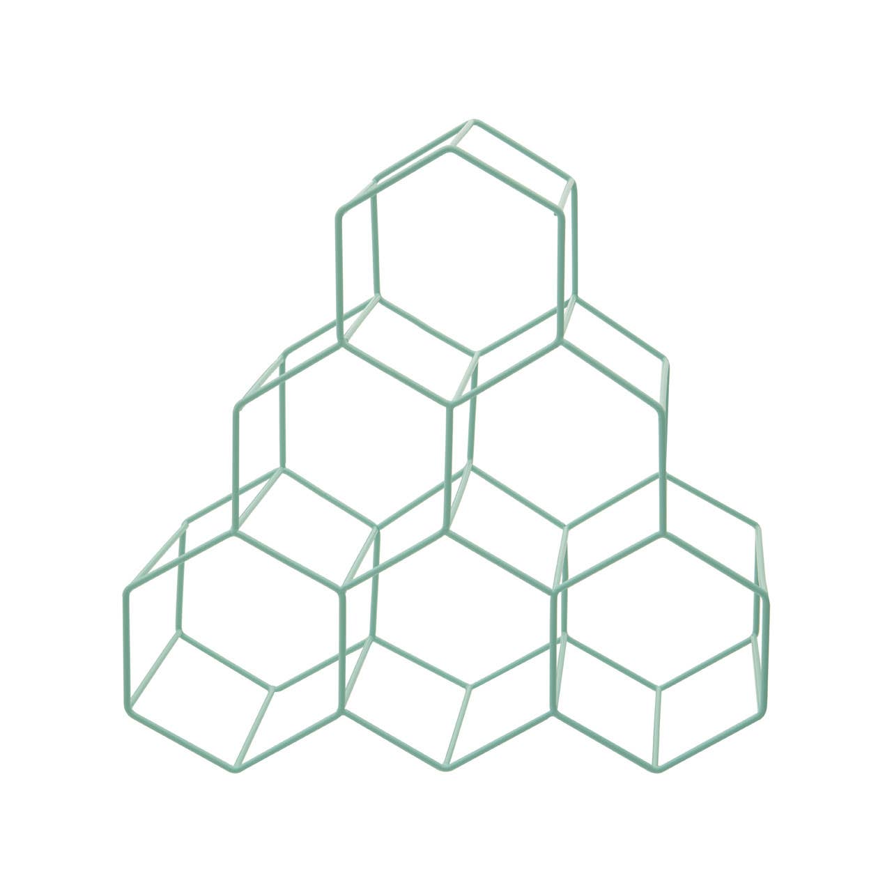 "This wine rack's green plated finish styles well with colourful metallic utensils and cookware. Constructed from sturdy iron wires, its distinctive geometric structure creates six hexagonal bottle holders, stacked in a honeycomb formation. The angled shape of each individual holder ensures that bottles remain securely in place."