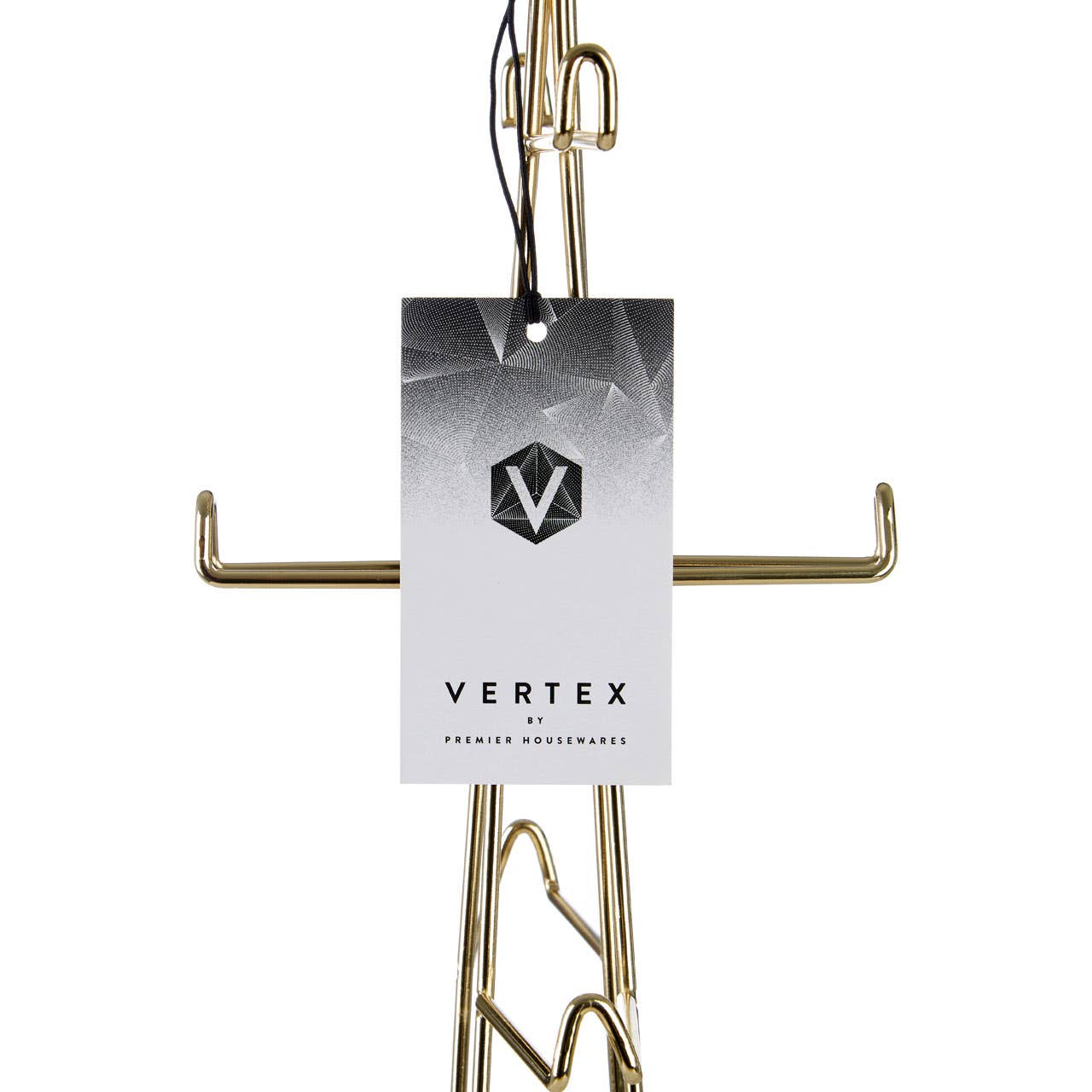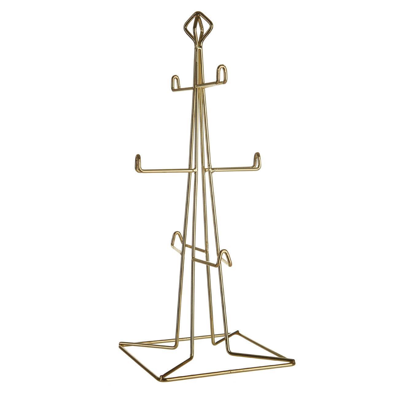 "Formed from strong iron wire, the Vertex mug tree boasts a warm gold finish. Its broad base ensures stability, while the tree's wire frame ends in a diamond shaped finial at the top. Each of its six arms curves upwards at the tip which ensures that mugs don't slide off while being displayed. Coordinate it with the Vertex fruit basket."