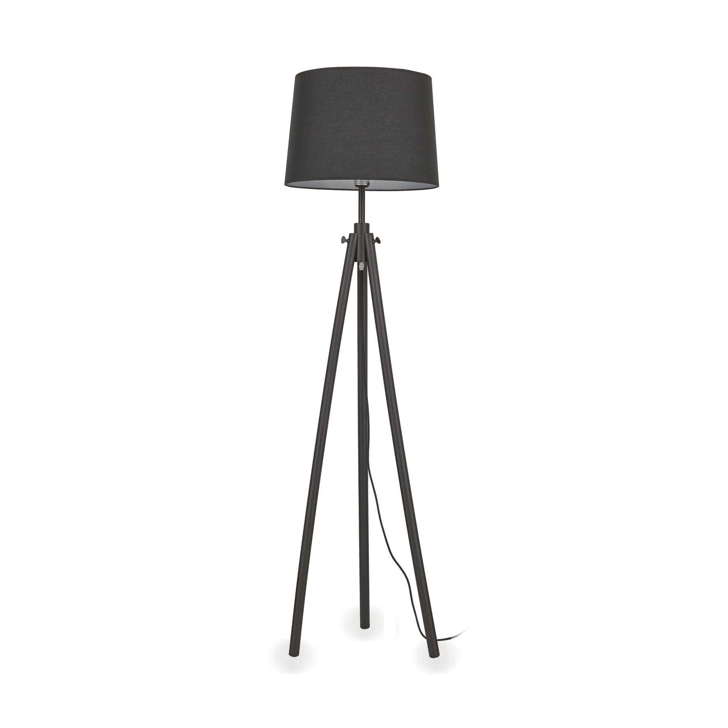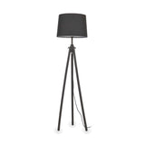 Natural wooden tripod stand with metal details. PVC foil shade coated with fabric. Power cable coated with fabric. Available also with white or black shades and frame.